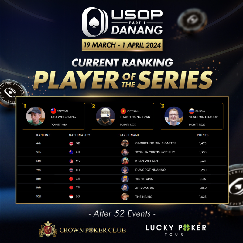 Một bảng xếp hạng đa quốc gia, 10 cái tên đứng đầu đến từ 9 đất nước khác nhau. Sau 52 event, Tao Wei Chang từ Taiwan là người dẫn đầu với 1810 điểm. Xếp ở thứ 2 và thứ 3 là cuộc đua rất sát sao giữa Trần Thanh Hùng, Việt Nam, 1575 điểm và Vladimir Litasov, Nga, 1525 điểm. Các VĐV còn 19 event nữa trên thi đấu cho chiếc nhẫn vàng USOP Player of the Series.